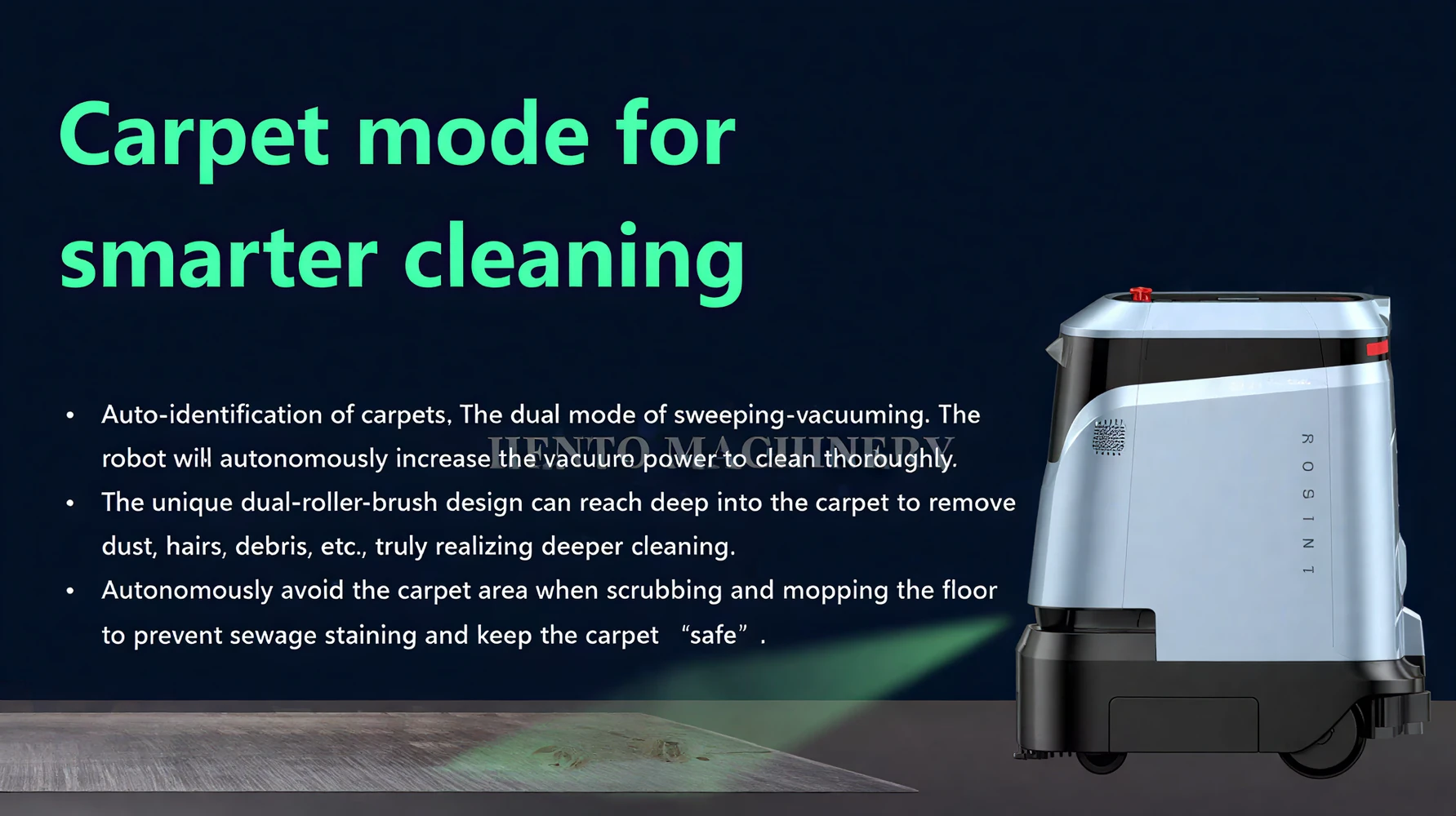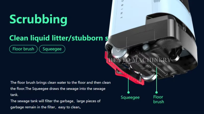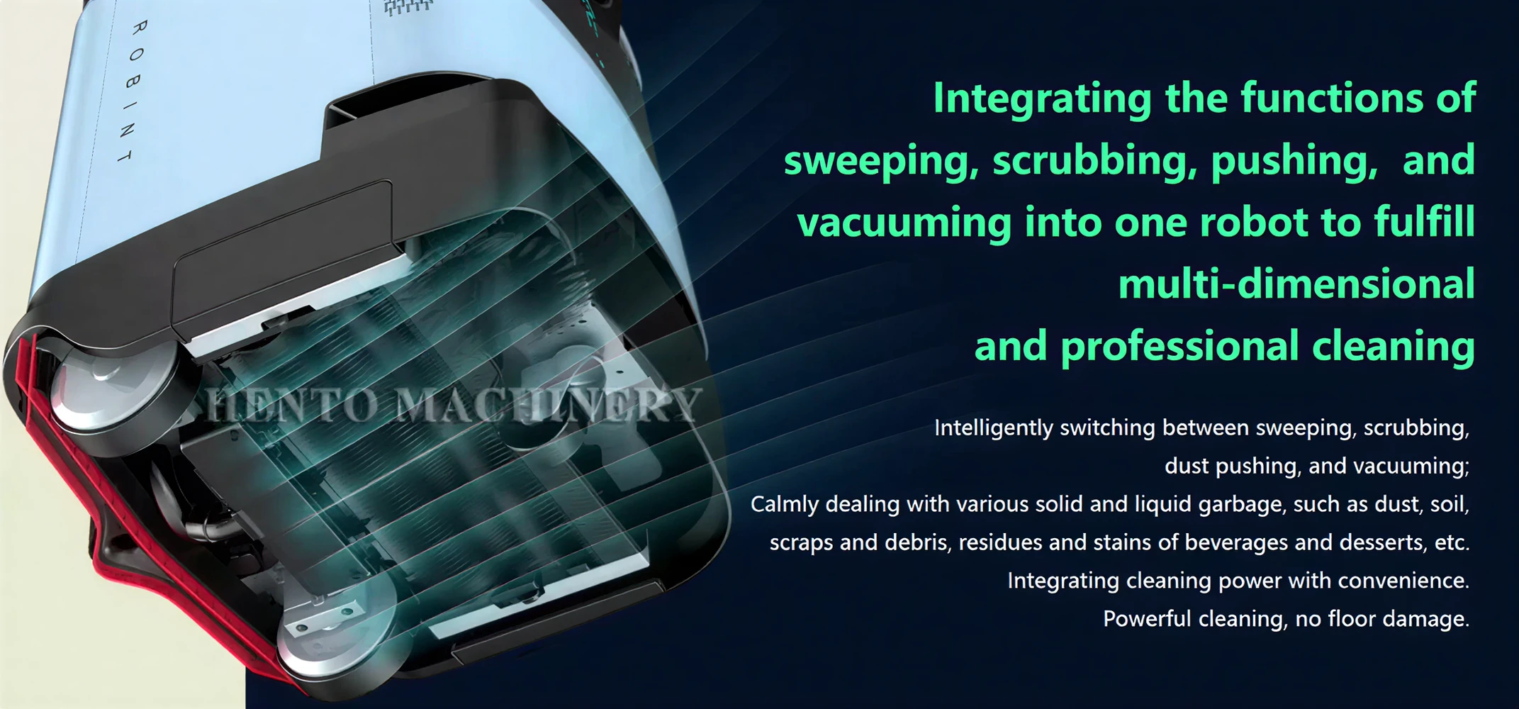 A robot egyesíti a seprés, súrolás, tolás és porszívózás funkcióit, intelligensen váltva a különböző üzemmódok között. Hatékonyan kezeli a szilárd és folyékony szennyeződéseket, miközben erőteljes tisztítást biztosít a padló károsítása nélkül.